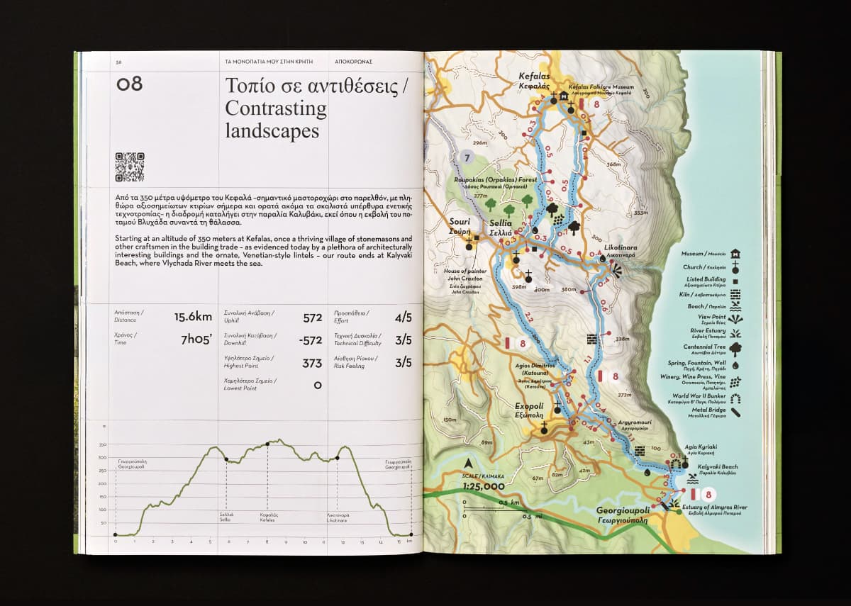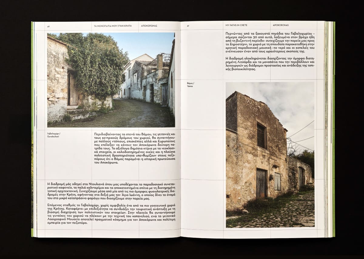 Design of a publication for the first integrated network of hiking trails in Crete. Based on the cartographic canvas and utilizing creative typography and the appropriate combination of papers, the publication captures the experience of hiking, while conveying the history and atmosphere of Crete.